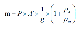 式中:m——專用砝碼質量,kg;P——被測量壓力值,Pa;A′——被檢活塞的有效面積,㎡;ρa——周圍空氣密度,kg/m3;ρm——專用砝碼、活塞及其連桿材料密度,kg/m3;g——活塞式壓力計使用地點的重力加速度,m/s2。